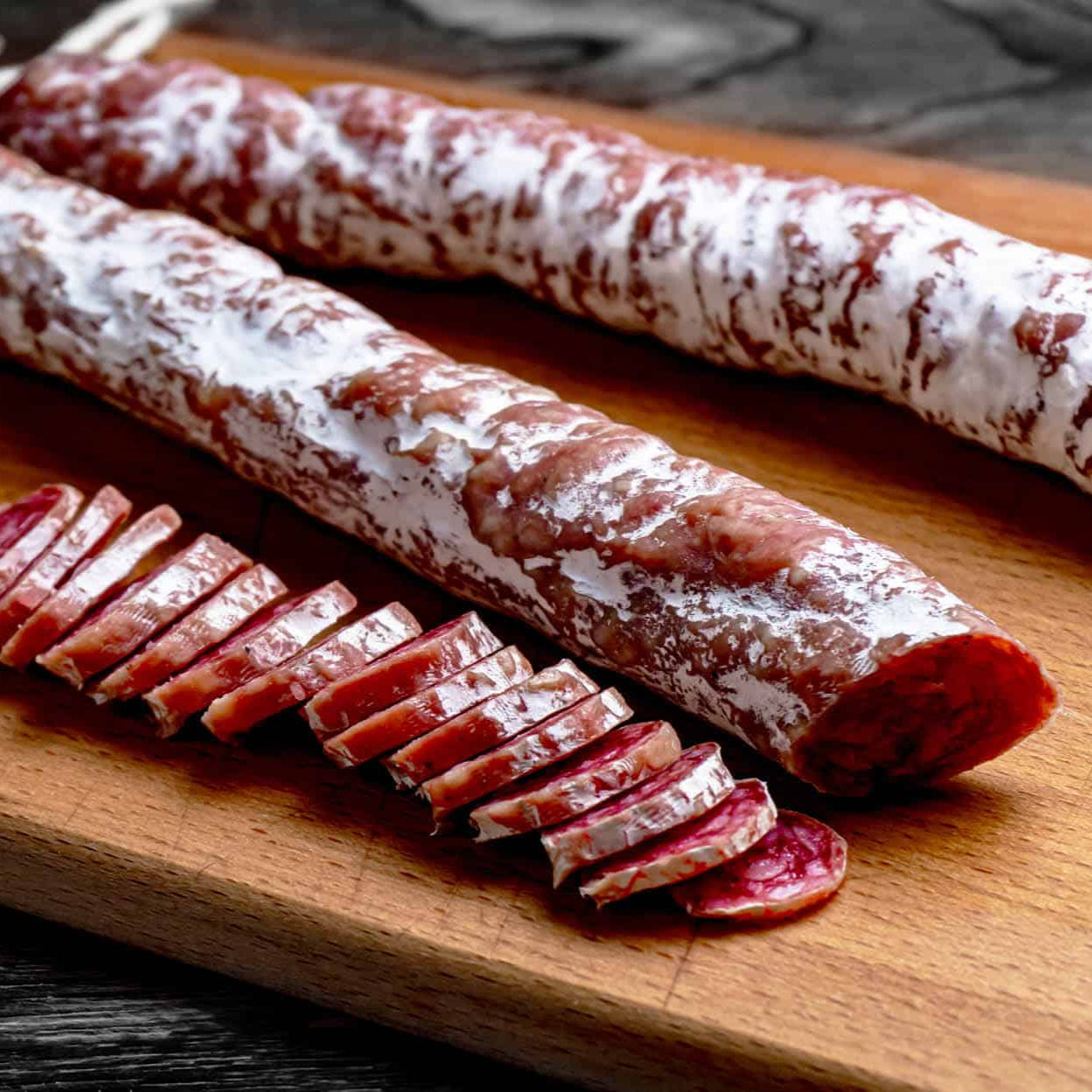 "Le Fouet" is a type of thin dry sausage, originally from the south of France (notably French Catalonia). The traditional version is a small-caliber, very lean cured meat, typically made from pure pork, stuffed into a fine natural casing, slightly curved or straight, and well dried. It's a popular choice for aperitifs and casual snacking.